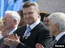 Президент Виктор Янкуович(ортодо), парламент төрагасы Владимир Литвин(оңдо) жана премьер-министр Николай Азаров(солдо) Украинанын эгемендигин белгилөө салтанатында. Киев. 24-август 2010
