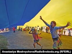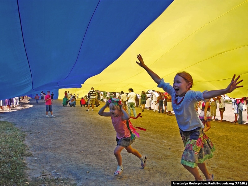 Украин туусунун күнү. Мамаев конушунда көтөрлгөн улуттук туунунун астында сүйүнүп жүргөн балдар. Киев. 23-август 2010