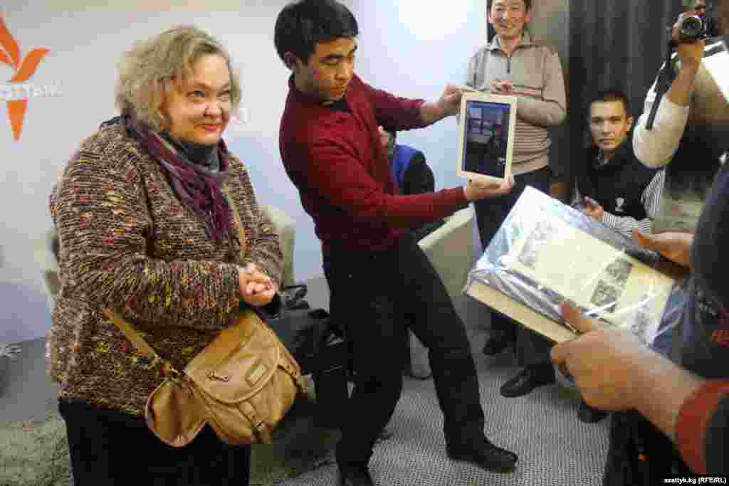 "Азаттыктын" веб-редактору Шайырбек Мукарамов Бегимай Асеевага сыйлык тапшырууда.